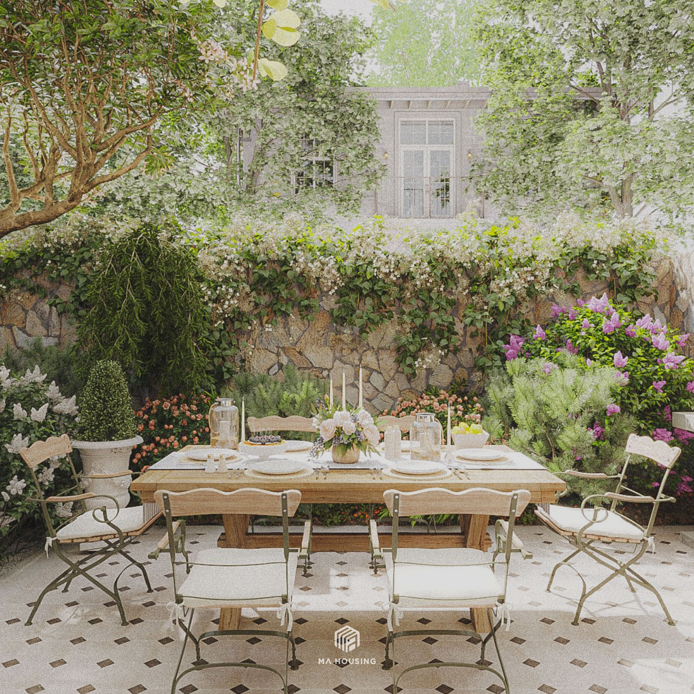 Bên cạnh thiết kế và thi công nội thất, MA Housing cũng cung cấp dịch vụ thiết kế thi công ngoại thất: cảnh quan sân vườn, tiểu cảnh bên ngoài,.. sao cho thống nhất với định hướng thẩm mỹ của phong cách nội thất.